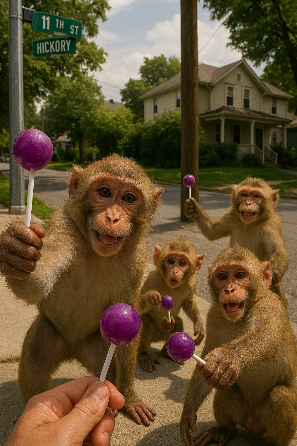 The animals were first reported at the intersection of 11th Street and Hickory at approximately 5:00 AM. According to a Nextdoor community post that quickly went viral, the monkeys appeared calm and approachable, with multiple animals carrying the purple grape-flavored confections. The group showed no aggressive behavior and instead actively offered the lollipops to a nearby resident — who, in a decision that has since sparked considerable public debate, accepted and consumed one.